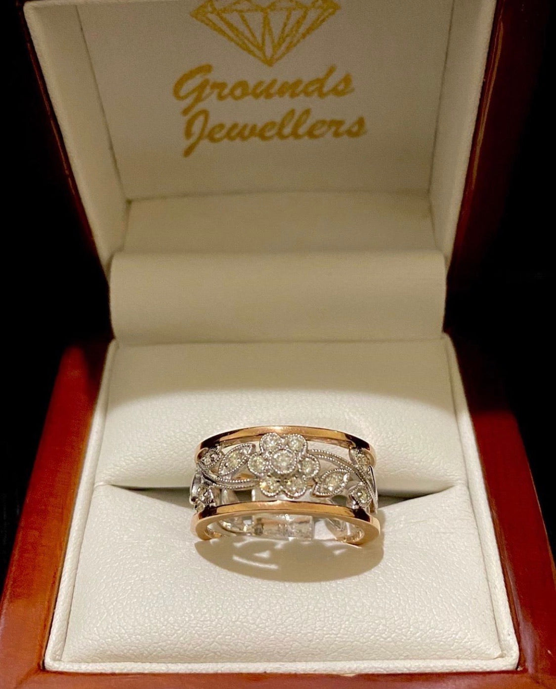 9ct Two Tone Gold Filigree Flower Diamond Dress Ring
